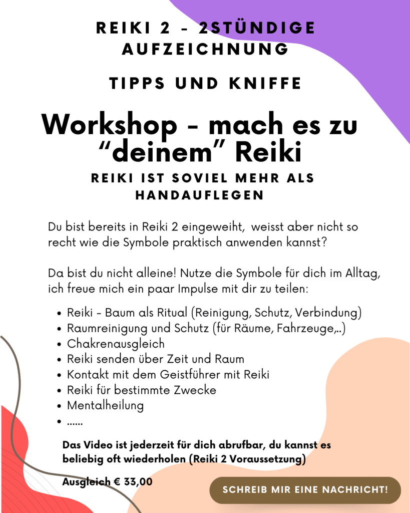 Du bist bereits in Reiki 2 geweiht? Und weisst nicht, was du alles mit Reiki anfangen kannst und Symbole verwirren dich? Dann ist mein Workshop genau richtig für dich, denn Reiki ist soviel mehr als Handauflegen, und du darfst es zu deinem Reiki machen! Nutze diesen 2stündigen aufgezeichneten Reiki Fresh up und ich gebe ich dir eine kurze und knackige Wiederholung was Reiki ist, wo Reiki herkommt und wie Reiki wirkt. Sehr bildhaft wiederholen wir kurz die Symbole und Ihre Bedeutung. Schritt für Schritt gehen wir eine Fernanwendung durch. Dann biete ich dir einige Ideen an, wie du Reiki für dich genau so verwenden kannst, wie du es brauchst, nämlich für deinen Alltag: